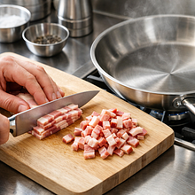 Cut the bacon into thin strips or cubes. Heat a dry skillet (without oil) over medium heat. Add the bacon and fry for 6-8 minutes, stirring every 30-40 seconds, until the fat renders and the pieces become golden and crispy. Transfer the cooked bacon to a plate lined with paper towels to drain excess fat. Keep the fat from the skillet — it can be used to sauté croutons or to add a teaspoon to a bowl of soup as an aromatic touch.