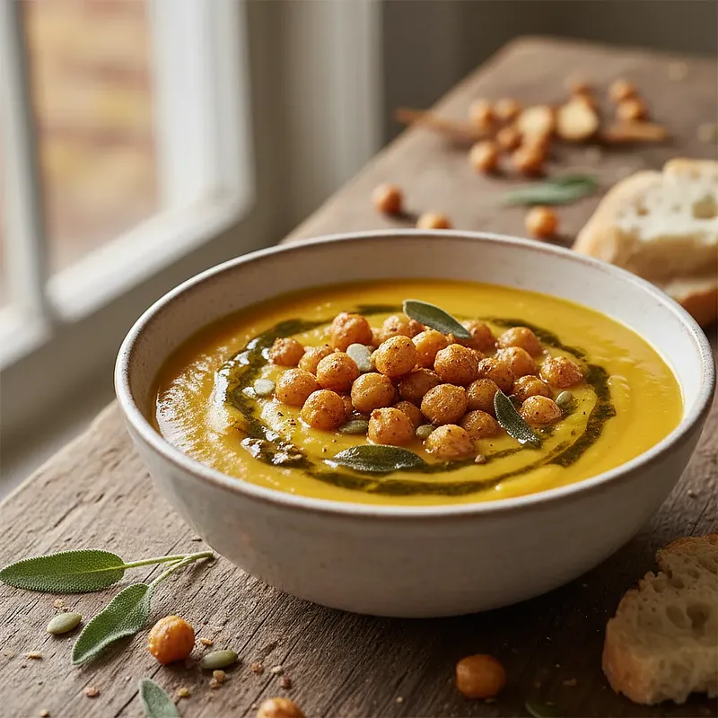 Rozlej gorącą zupę do miseczek. Każdą porcję udekoruj solidną garścią chrupiącej ciecierzycy. Następnie polej odrobiną aromatycznego oleju szałwiowego i ułóż na wierzchu kilka chrupiących listków szałwii. Jeśli używasz, posyp dodatkowo uprażonymi pestkami dyni.
