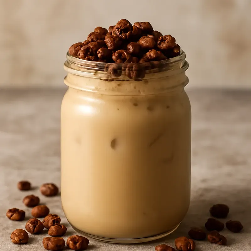 A delicate, creamy dessert in a jar that combines the intense flavor of coffee with the velvety texture of mascarpone and cream, along with crunchy homemade caramel made from roasted coffee beans. Inspiration: coffee as an ingredient not just for drinking — here, the beans become a textural and decorative element. The dessert has layers: a buttery cookie base, a coffee cream made from mascarpone and cream with a hint of vanilla, and shiny caramel with slightly crushed roasted coffee beans. Serve in small jars as a dessert after dinner or as a sweet touch during afternoon coffee. Qualities: a contrast of creamy smoothness and crunchiness, a pleasant bitter-sweet note of coffee, and aesthetic layering that looks very impressive.