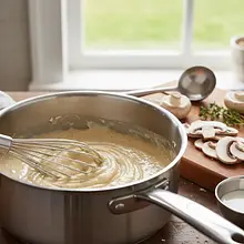 Now you need to temper the roux to prevent lumps from forming in the soup. Slowly pour one ladle of hot broth from the pot with potatoes into the hot roux in the saucepan, in a thin stream, while vigorously stirring with a whisk. A thick, smooth paste will form. Then add another ladle of broth and mix again. Pour the prepared, thinned roux into the pot with the soup, continuously stirring the soup with the whisk. Cook everything for another 2-3 minutes to let the taste of the flour disappear.