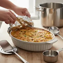 Aby upewnić się, że zapiekanka jest gotowa, wbij w jej środek ostry nóż lub widelec. Powinien on wejść w ziemniaki gładko, bez żadnego oporu. Jeśli czujesz, że ziemniaki są wciąż twarde, przykryj naczynie ponownie i piecz przez dodatkowe 10 minut, po czym sprawdź ponownie.