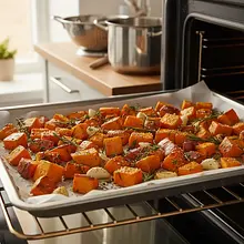 Wstaw blachę z warzywami do nagrzanego piekarnika. Piecz przez około 30-35 minut. W połowie pieczenia (po ok. 15 minutach) wyjmij blachę i przemieszaj warzywa łopatką, aby upiekły się równomiernie z każdej strony. Warzywa są gotowe, gdy staną się miękkie (widelec powinien wchodzić w nie bez oporu) i lekko skarmelizowane na brzegach.