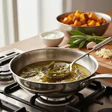 Na tej samej patelni rozgrzej łyżkę oliwy. Oderwij listki szałwii od łodyżek. Gdy oliwa będzie gorąca, ostrożnie połóż na niej listki szałwii w jednej warstwie. Smaż przez około 30-60 sekund z każdej strony, aż staną się ciemnozielone, sztywne i chrupiące. Wyjmij je łyżką cedzakową na talerz wyłożony ręcznikiem papierowym, aby odsączyć nadmiar tłuszczu.