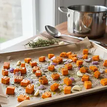 Carefully remove the hot baking sheet from the oven. Transfer all the roasted vegetables (pumpkin, onion, and garlic) to a large heavy-bottomed pot. If there are any browned, tasty juices left on the parchment paper, scrape them off and add them to the pot as well.