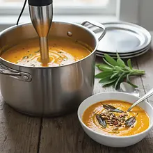 Remove the pot from the heat. Using an immersion blender, blend the soup directly in the pot until it is perfectly smooth and velvety. Move the blender up and down and around the pot to ensure there are no lumps. Blend for about 2-3 minutes. If you don't have an immersion blender, pour the soup in batches into a countertop blender. Remember to let it cool slightly before blending and do not fill the jar more than halfway, as hot soup can expand rapidly.