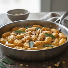 To danie to kwintesencja jesieni zamknięta na talerzu. Aksamitne, delikatne kluseczki gnocchi otulone kremowym, intensywnie pomarańczowym sosem z pieczonej dyni Hokkaido, której naturalna słodycz idealnie komponuje się z ziemistym aromatem świeżej szałwii. Całość wzbogacona jest o chrupiące, prażone orzechy laskowe, które dodają potrawie tekstury i głębokiego, orzechowego posmaku. Wykończenie w postaci świeżo startego parmezanu i szczypty gałki muszkatołowej podbija smak i dodaje elegancji. Danie jest niezwykle sycące i rozgrzewające, idealne na chłodne dni. Choć wygląda jak propozycja z najlepszej restauracji, jest zaskakująco proste w przygotowaniu i stanowi doskonały pomysł na wyjątkowy obiad czy romantyczną kolację. Podawaj je jako samodzielne danie główne, ciesząc się bogactwem smaków i kolorów.