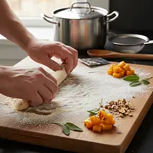 Divide the dough into 4 equal parts. Roll each part on a lightly floured countertop into a log about 2 cm thick (the thickness of your thumb). Using a sharp knife or scraper, cut the log into small pieces about 2-2.5 cm long. To give the gnocchi their characteristic shape that helps hold the sauce, you can gently press each piece with your thumb against the tines of a fork and slide it off, creating a dimple on one side and grooves on the other. Place the formed gnocchi on a tray or board generously sprinkled with flour, ensuring they do not touch each other.