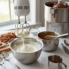 Ice cream without a machine, like this one, works on a simple physical principle. The high fat content (from the cream) and sugar (from the condensed milk) lowers the freezing point of water, which prevents the formation of large, hard ice crystals and allows for a creamy consistency even with slow freezing in a home freezer.