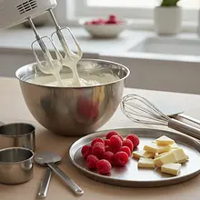 In a large, chilled bowl, place very cold 36% heavy cream. Using a hand mixer or stand mixer with a whisk attachment, start whipping the cream on low speed. Gradually increase the speed to maximum. Whip for about 3-5 minutes until the cream becomes thick and fluffy, and when you remove the beaters, stiff peaks (known as 'stiff tips') will hold their shape.