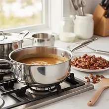Pour the sugar evenly into a saucepan with a thick, light-colored bottom. Place it on a medium heat burner. Do not stir the sugar at the beginning! Patiently wait for it to start melting and changing color to amber at the edges. You can only gently swirl the saucepan to help the sugar melt evenly. Once most of the sugar is liquid, you can gently stir with a wooden spoon to dissolve the last crystals. Reduce the heat to the minimum.
