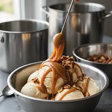 Before serving, take the ice cream out of the freezer for 5-10 minutes to soften slightly – this will make scooping easier. Use an ice cream scoop dipped for a moment in hot water to form perfect balls. Serve in cones or bowls, drizzling with the remaining caramel sauce and sprinkling with toasted pecans and a pinch of sea salt flakes for contrast.