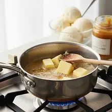 In a small saucepan with a light bottom, place 80g of diced butter. Heat over medium power, allowing it to melt. When the butter starts to foam and 'pop', begin stirring it with a spatula. Continue heating for 3-5 minutes. Pay attention to the change in aroma to a strong nutty scent and the appearance of brown bits at the bottom. As soon as you notice this, immediately remove the saucepan from the heat and pour the butter along with the bits into a bowl to stop the cooking process. Set aside to cool completely.