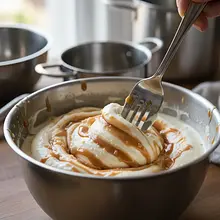 After an hour, take the container out of the freezer. Using a fork or spoon, vigorously stir the mixture, trying to 'break up' the ice crystals forming at the edges and on the bottom. Place it back in the freezer. Repeat this process 2-3 more times at hourly intervals. This is a key step that mimics the work of an ice cream maker and ensures a creamy consistency.