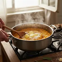 Reduce the heat to medium-low. Using a ladle, pour in the first portion of hot broth, just enough to cover the rice. Stir slowly and almost continuously until the rice absorbs all the liquid. Only then add another ladle of broth. Repeat this process patiently, ladle by ladle, for about 10 minutes. Stirring releases the starch from the grains, creating a natural, creamy emulsion.