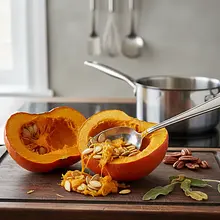 Preheat the oven to 200°C (fan). Wash the pumpkin, cut it in half, and remove the seeds with a spoon. Do not peel the skin. Cut the pumpkin into smaller pieces (about 3-4 cm), place them on a baking sheet lined with parchment paper, drizzle lightly with oil, and bake for 20-25 minutes until the flesh is completely soft (check with a fork). After baking, let it cool slightly, then separate the flesh from the skin (it should come off easily) and blend into a smooth purée. Measure out the required 400g of purée.