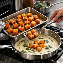 Preheat the oven to 200°C (top and bottom, no fan). Peel the pumpkin: place it securely on the board and cut off both ends. Cut it in half lengthwise, scoop out the seeds with a spoon, and cut the flesh into cubes about 2 cm on each side. In a large bowl, mix the diced pumpkin with 15 g of olive oil, 1 g of salt (about 1/3 teaspoon), 1 g of freshly ground pepper, and a pinch of nutmeg. Spread evenly on a baking sheet lined with parchment paper.