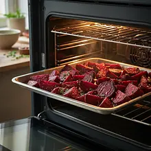 Place the tray with the beets in the preheated oven and bake for about 60-90 minutes. The baking time depends on the size of the beets. After 60 minutes, check their tenderness by carefully peeling back the foil and inserting a thin knife or fork into the center of the largest beet. It should slide in smoothly, with no resistance. If the beets are still hard, continue baking, checking every 15 minutes.