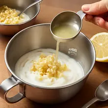 Prepare your workstation (mise en place). Take out all the ingredients and tools: a medium bowl (about 1 l), a measuring cup or kitchen spoon, a garlic press or fine grater (microplane), a knife and cutting board, a whisk or mixing spoon, and a teaspoon for tasting.