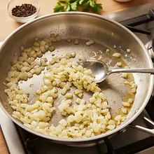 While the dumplings are cooking, prepare the sauce. Clean the mushrooms thoroughly with a brush or a damp cloth (avoid soaking them in water, as they will absorb it). Cut off the tough ends of the stems. Slice the mushrooms into thicker pieces (about 0.5 cm). Peel the onion and chop it into small cubes. In a large pot or deep skillet, heat 40g of butter over medium heat.