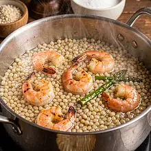 Rinse the pearl barley under cold water in a sieve until the water runs clear. Place the pearl barley in a pot with a capacity of about 2 liters and add water in a 1:2.5 ratio (for 200 g of pearl barley, use ~500 ml of water). Add a pinch of salt. Bring to a boil over medium heat, then reduce the heat to low and cook covered for 25-30 minutes until the grains swell and are tender but not falling apart. If the water evaporates too soon, add 50-100 ml of boiling water.
