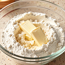Rubbing butter with dry ingredients: add the chopped butter to the bowl with flour. Quickly rub it in with your fingers or use a pastry cutter (or a mixer with a dough attachment) until the mixture resembles coarse crumbs with a few larger pieces of butter (the size of peas).