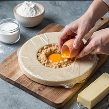 Adding the egg and combining the dough: make a well in the center of the crumble, crack in 1 egg (keep the other for brushing), quickly mix the center with a fork, then knead with your hands or a silicone spatula just until the dough starts to come together. Do not knead for long — it should form a compact, slightly lumpy dough. Shape the dough into a disk, wrap it in plastic wrap, and place it in the fridge for 15–20 minutes to firm up and make it easier to roll out.