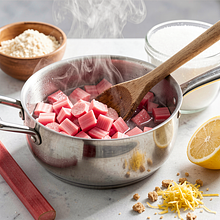 Prepare the rhubarb: wash the stalks, trim the woody ends, and cut into pieces about 1 cm long. In a medium saucepan, add the chopped rhubarb and 60 g of sugar (from your supply), and optionally, a teaspoon of fresh lemon zest. Heat over medium heat, stirring every 1–2 minutes for 6–8 minutes until the rhubarb softens and starts to release juice.
