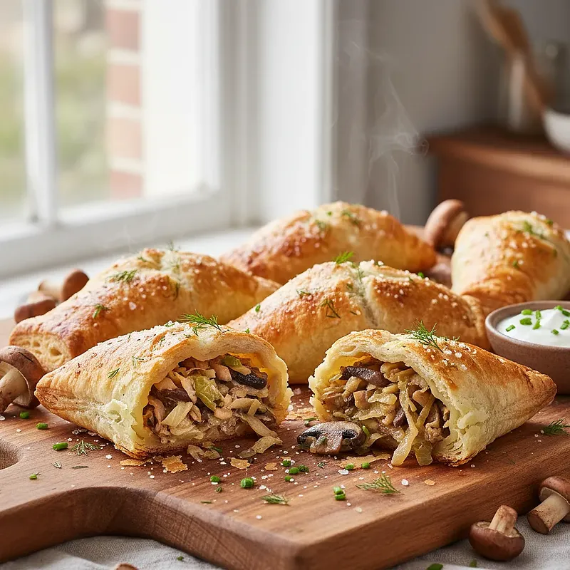 Cabbage and mushroom pastries are an absolute classic of Polish cuisine, an inseparable element of the Christmas Eve table, traditionally served with clear, rich red borscht. This recipe is a tribute to tradition in a modern, refined version. The secret is the half-puff pastry, which, thanks to the technique of cutting cold fat into the flour and gentle folding, achieves an extraordinary, flaky structure. It is wonderfully buttery, crispy, and melts in your mouth, while being much simpler to prepare than classic puff pastry. The filling is the essence of flavor – intensely mushroomy thanks to dried porcini, with perfectly balanced acidity from sauerkraut, complemented by the sweetness of slowly sautéed onions. The whole is seasoned with marjoram, which adds herbal depth. Visually, the pastries look incredibly appetizing – small, neat rectangles with a golden-brown, glossy crust from the egg yolk, often sprinkled with caraway seeds or black cumin. This dish creates the atmosphere of holidays and family gatherings.