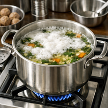 Rinse the pearl barley 160 g under cold water in a sieve to remove any dust. After 30 minutes of boiling the broth, add the barley to the pot. Slightly increase the heat for 2–3 minutes until it starts to gently boil again, then reduce the heat and cook for another 35–40 minutes. The barley should be soft when tasted – it is ready when it is soft inside but not mushy.
