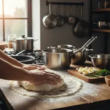 Transfer the dough to a lightly floured surface and knead vigorously for about 10 minutes. Knead the dough by pushing it away from you with your wrist, folding it in half, and turning it 90 degrees. Repeat this motion. The dough is ready when it becomes smooth, elastic, and no longer sticks to your hands. Form it into a ball, place it in a bowl dusted with flour, cover it with a cloth, and set it in a warm place for about 60-90 minutes, until it doubles in size.