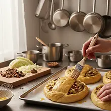 Brush the edges of the dough with water or beaten egg, which will help seal it. Roll the dough into a log, starting from the longer side. First, fold one side over the filling, then cover it with the other, creating a long, closed roll. Seal the edges of the dough thoroughly along the entire length and at the ends, tucking them underneath to prevent the filling from leaking during baking.
