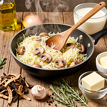 Add the drained and chopped cabbage (800 g) and the drained and chopped mushrooms (after soaking) to the onion. Sauté everything over medium heat for 10–12 minutes, stirring every 2–3 minutes. If the filling looks dry, add 2–3 tablespoons (30–40 ml) of the mushroom soaking water. Season with 2 g of black pepper and 2 g of marjoram; if the cabbage requires it, add 5 g of salt — remember that sauerkraut is salty on its own. Cook over low heat for another 5–8 minutes, until the cabbage is tender but not mushy.