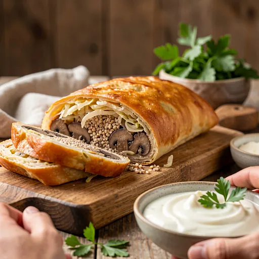 Traditional Polish kulebiak in a regional version: layered yeast dough filled with stewed sauerkraut, wild mushrooms, and loose buckwheat groats. A dish known from Eastern European tables, popular here for special occasions and Sunday dinners. Kulebiak is aromatic (cabbage and mushrooms), has a contrast of textures: soft dough, moist filling, and a slightly crispy crust after being brushed with egg. Serve warm as a main dish with sour cream or as a cold element on a festive table. Visually impressive with its golden crust and a cross-section revealing layers of cabbage, groats, and mushrooms.