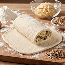 Shaping the kulebiak: roll out the risen dough on a lightly floured surface into a rectangle measuring about 40x30 cm (thickness approx. 0.5–1 cm). In the center of the rectangle, evenly spread the filling along the longer side, leaving a 3–4 cm free edge on the sides. Roll the dough into a log like a sponge cake roll, starting from the longer edge, pressing the edges to seal tightly. Pinch the ends well and slightly tuck them under. Transfer the kulebiak seam side down onto a baking sheet lined with parchment paper.