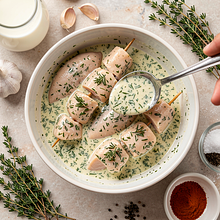 Delicate pieces of chicken breast marinated in buttermilk with the addition of fresh and dried herbs, garlic, and lemon, skewered and grilled or cooked on a grill pan. The dish combines a Polish rustic character (buttermilk, marjoram, thyme) with a technique popular for kebabs; the result is a juicy interior and herby crust with a subtle citrus note. Ideal to serve on fresh spring asparagus or with young potatoes and a parsley salad. The recipe includes detailed instructions for cutting, marinating, skewering, and recognizing doneness, making it suitable for someone making kebabs for the first time.