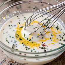 In a large bowl, pour in the buttermilk (200 ml). Add 30 g of rapeseed oil, crushed garlic (15 g - press through a garlic press or finely chop), grated zest from half a lemon, and 30 g of lemon juice (freshly squeezed). Add thyme (10 g), marjoram (2 g), sweet paprika (5 g), salt (5 g), and black pepper (2 g). Whisk for about 30 seconds until the ingredients form a homogeneous, slightly thick marinade.