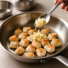 In a heated pan with a little oil, sauté the chicken until it is lightly golden. Add ginger and garlic, and sauté for 1-2 minutes.