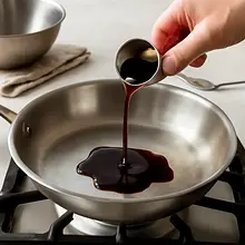 After frying all the pieces, reduce the heat to medium. Drain excess fat from the pan if there is a lot, leaving 1-2 teaspoons for flavor. Pour in the reserved marinade (30-40 g) and heat for 1-2 minutes, stirring until it starts to bubble. In a small bowl, dissolve 20 g of cornstarch in 60 ml of cold water (stir until there are no lumps). Pour the slurry into the sauce in the pan in a thin stream, simultaneously stirring with a whisk or spoon. Cook for 2-3 minutes until the sauce thickens to a glaze consistency — it should be smooth, shiny, and slightly bubbling.