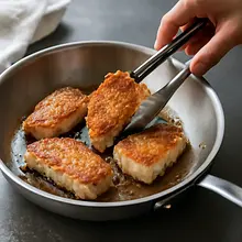 Turn the pieces of chicken over and fry for another 4-5 minutes, until the meat is golden brown and cooked through. Check with a skewer or thermometer — the safe internal temperature is 75°C. If you don't have a thermometer, cut into the largest piece: the meat should be white/slightly pink in the center without any raw traces, and the juices should be clear.