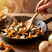 Adding chanterelles and frying: slightly increase the heat to medium-high and add the chanterelles to the pan in a single layer, if possible. Fry without frequent stirring for 2–3 minutes to lightly brown them, then stir every 1–2 minutes for another 4–6 minutes. The mushrooms will release their juice and should shrink; continue frying until the juice almost evaporates and the edges of the chanterelles are golden and slightly crispy — this is a sign that they are ready.
