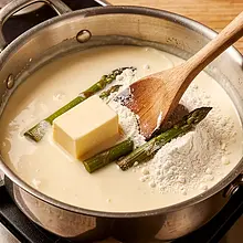 In a heavy-bottomed pot, melt the butter over low heat. When it starts to foam, add the flour and continuously stir with a wooden spoon or a whisk to create a light roux. Cook for 2–3 minutes over low heat, until the flour no longer smells raw, but does not brown.