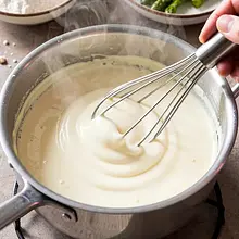 Add salt (1–2 g), black pepper, and grated nutmeg to the sauce; if you are using 18% cream (optional), lower the heat and mix it with 2–3 tablespoons of the sauce, then combine it with the rest of the béchamel. Taste the sauce — be careful with the salt, as oscypek is salty.