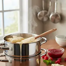 Prepare a water bath to melt the chocolate. Pour water into a small pot to a height of about 2-3 cm and bring to a boil. Reduce the heat to the minimum so that the water only lightly steams. Place a metal or glass bowl on top of the pot that is larger than the diameter of the pot and does not touch the surface of the water. Add broken pieces of white chocolate to the bowl. Stir with a silicone spatula until the chocolate is completely melted and smooth. Remove the bowl from the pot and set aside to cool slightly.
