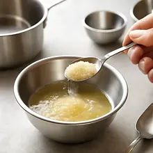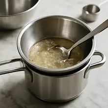 In a small saucepan, gently heat the swollen gelatin (do not boil): place the bowl with the gelatin in a water bath or heat it over low heat, stirring constantly until it becomes liquid and transparent (about 30–60 seconds on low heat). Set aside to cool slightly (to lukewarm temperature).