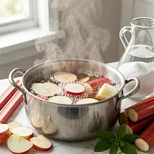 Trim the tough ends off the rhubarb and cut the stalks into slices about 1 cm thick (approx. 400 g). In a medium pot with a capacity of 2 l, place the chopped rhubarb, apple peels, 150 g of sugar, and 400 ml of water. Gently stir with a wooden spoon to help the sugar adhere to the rhubarb pieces. Place the pot over medium heat and bring it to a gentle simmer (small bubbles, not vigorous). Reduce the heat to low and cook for 10–15 minutes, stirring every 2–3 minutes, until the rhubarb is very soft and the liquid has slightly thickened.