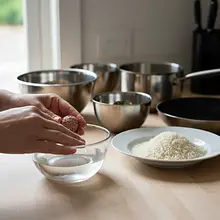 Prepare a small bowl of water to moisten your hands and a flat plate to spread out the dry basmati rice. Take portions of the meat mixture (about 1.5 tablespoons) and shape them in your moistened hands into a drop-like shape or a small pear - this will be the body of the hedgehog. Then, coat the wider part of the 'body' in the dry rice, gently pressing it in. The rice grains should embed into the meat and stick out like spikes. Place the formed hedgehogs on a cutting board.