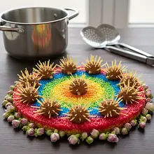 This extraordinary dish is a true culinary adventure, created especially for the youngest gourmets. 'Forest Glade' is a composition that transforms an ordinary meal into a magical story. The heart of the dish is tender, juicy turkey meatballs, shaped like adorable hedgehogs with 'spines' made of rice grains. They are simmered in a velvety, mild tomato sauce, which serves as the 'forest floor'. The hedgehogs rest on a 'rainbow glade' of fluffy rice, naturally colored with turmeric, spinach, and beet juice, which not only delights the eye but also sneaks valuable nutrients into the child's diet. The whole is complemented by 'trees' made of crunchy broccoli florets. The dish is not only appetizing and colorful but also balanced – providing protein, complex carbohydrates, and vitamins. It's the perfect way to encourage a picky eater to enjoy food and show that healthy meals can be a fascinating fun.