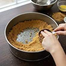 Place the butter in a small saucepan and melt it over low heat. Stir occasionally to prevent it from burning. Once the butter is completely melted, remove it from the heat. Crumble the biscuits into a medium-sized bowl, then pour the melted butter over them. Using a spoon or spatula, mix thoroughly until all the crumbs are moist. The consistency should resemble wet sand.
