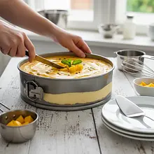 Prepare a 24 cm diameter springform pan. Line the bottom of the pan with parchment paper. To do this, place a sheet of paper on the bottom of the springform pan, then attach and close the ring, trimming any excess paper with scissors. Do not grease the sides.