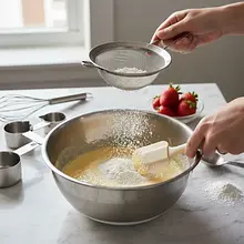 In a large bowl, combine the dry ingredients. Add the all-purpose flour, potato flour, and baking powder. Use a fine sieve and sift all the ingredients together at least twice. This step aerates the flour and prevents lumps from forming, which is crucial for the fluffiness of the sponge cake.